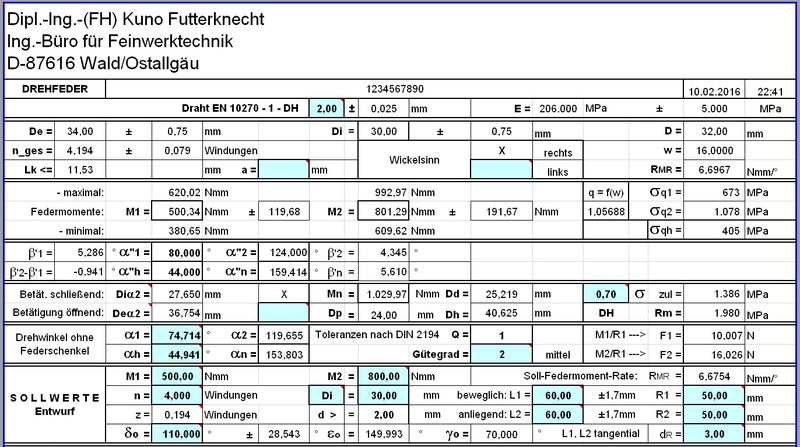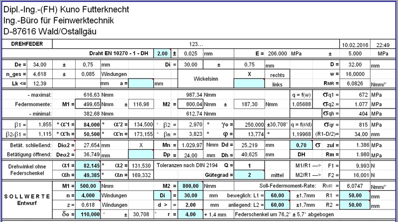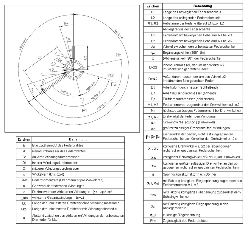 gemäß DIN EN 13906-3 (D) für die Berechnung und Konstruktion von kaltgeformten, zylinderförmigen Drehfedern - Schenkelfedern - mit linearer Kennlinie aus runden Drähten mit konstantem Durchmesser.