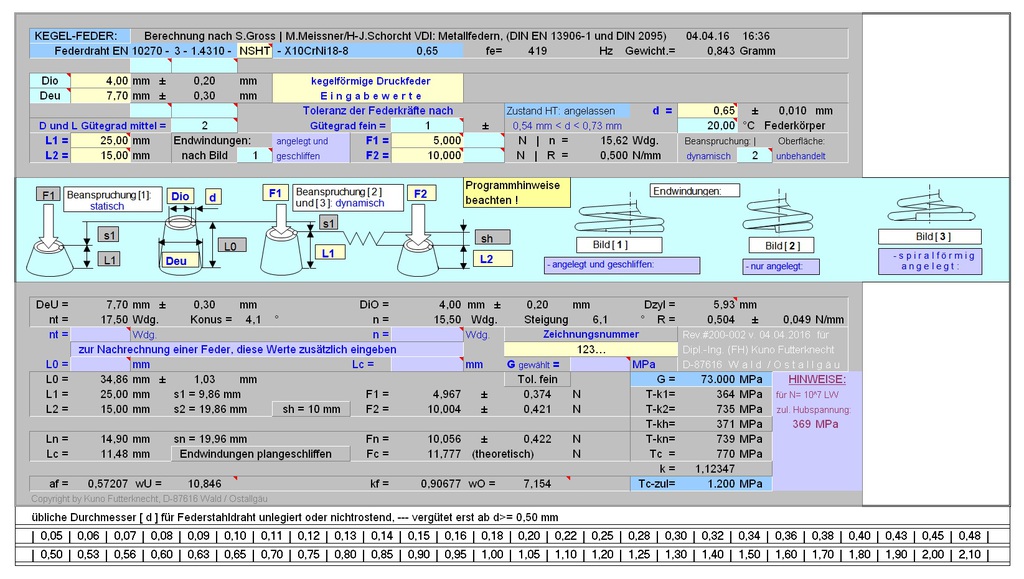 Bemerkungen zur Verwendung der Kegeldruckfeder und Name des Erstellers der Zeichnungsangaben sind im Tabellenblatt oben rechts angegeben.