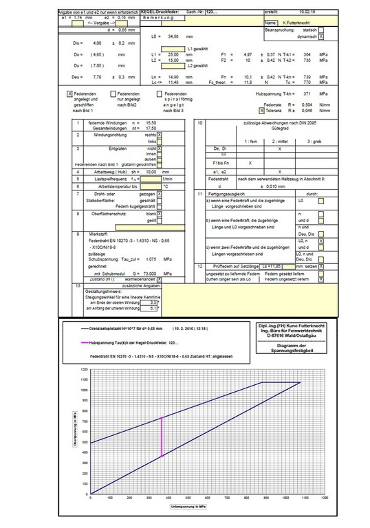 Im Tabellenblatt zu den Zeichnungsangaben sind alle rechnerisch ermittelten Parameter und Werkstoffdaten eingetragen.